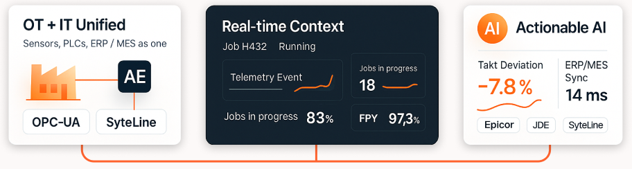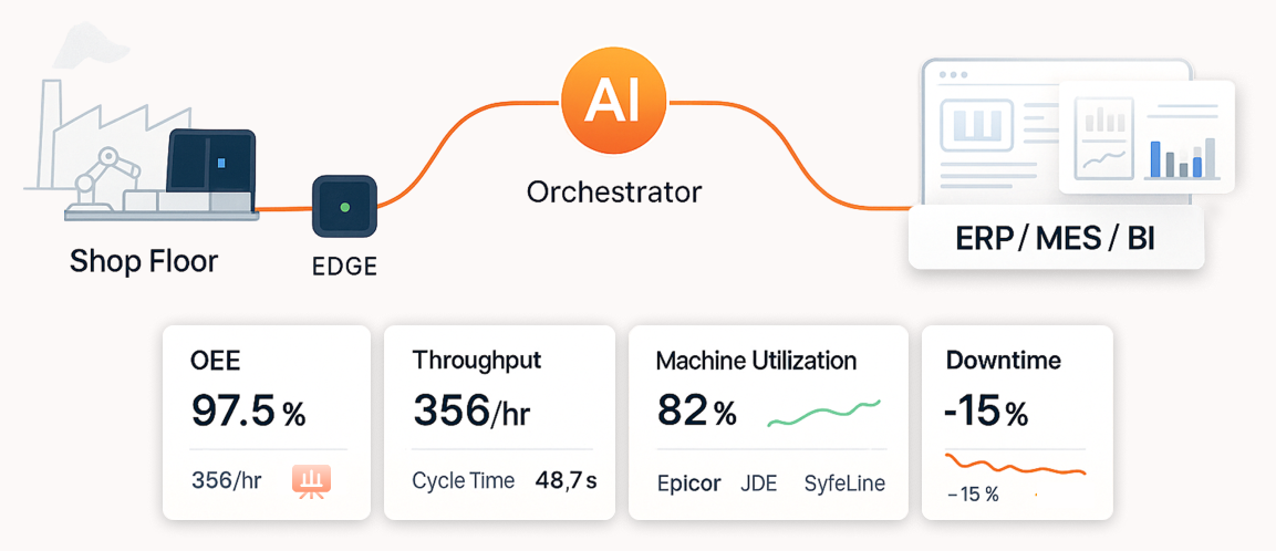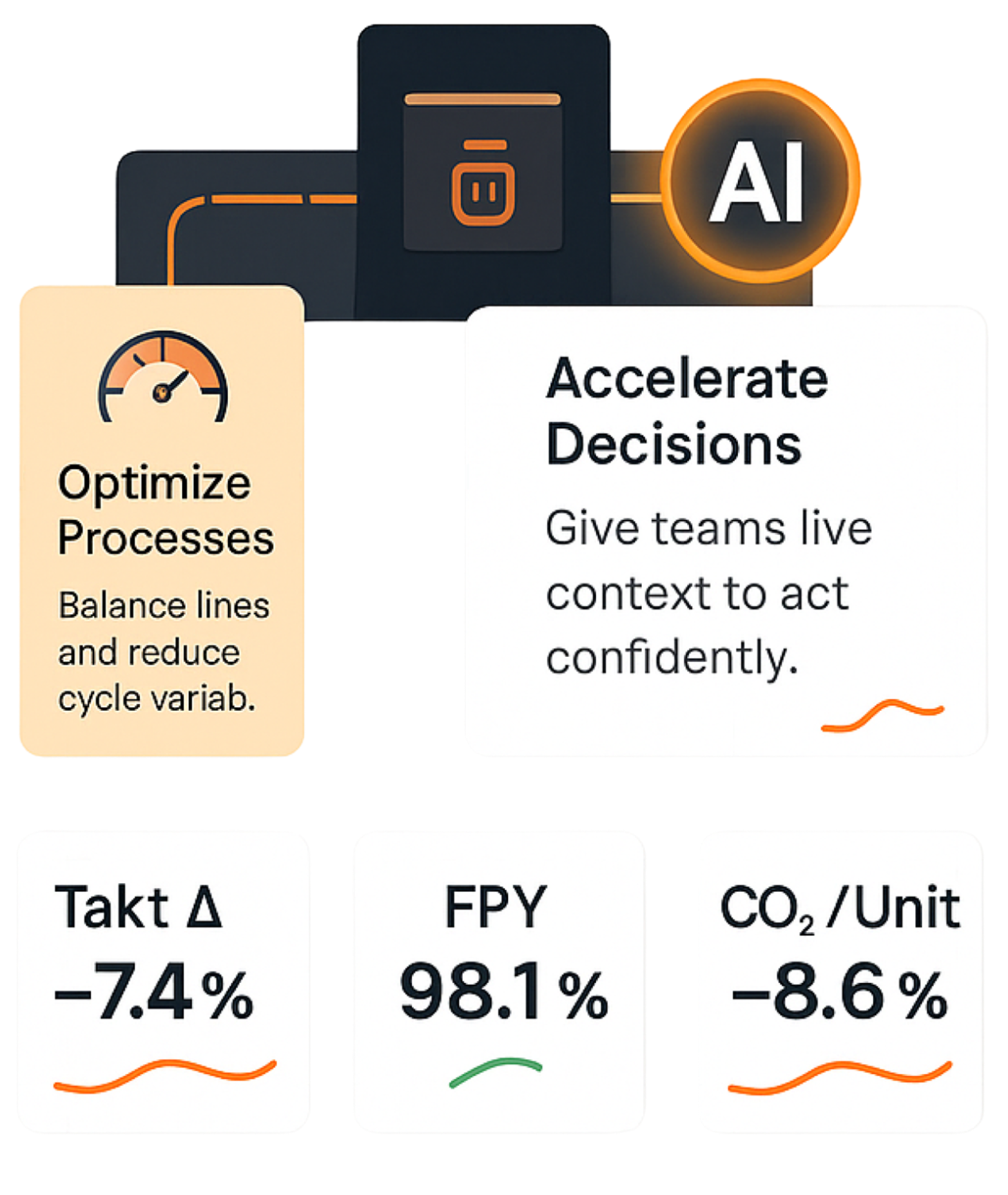 Today, our AI-powered production intelligence platform helps manufacturers gain a clear, real-time view of production — enabling teams to respond proactively, improve consistency, and continuously optimize performance.