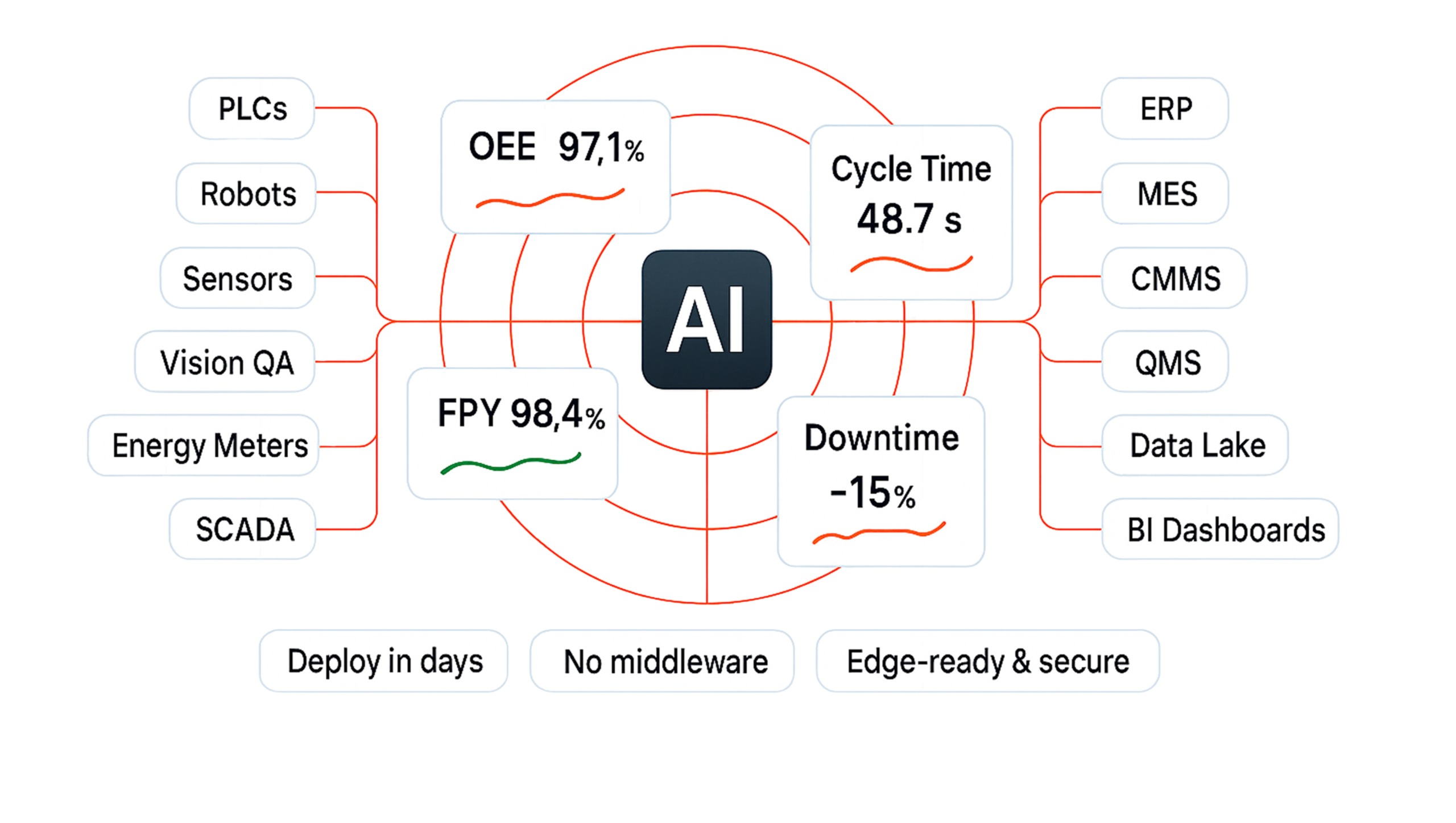 Unlike systems that add complexity, iDataOps integrates directly with your production equipments, robots, sensors, ERP, and MES systems. Our AI continuously learns from live production data — predicting issues, balancing workloads, and optimizing performance.